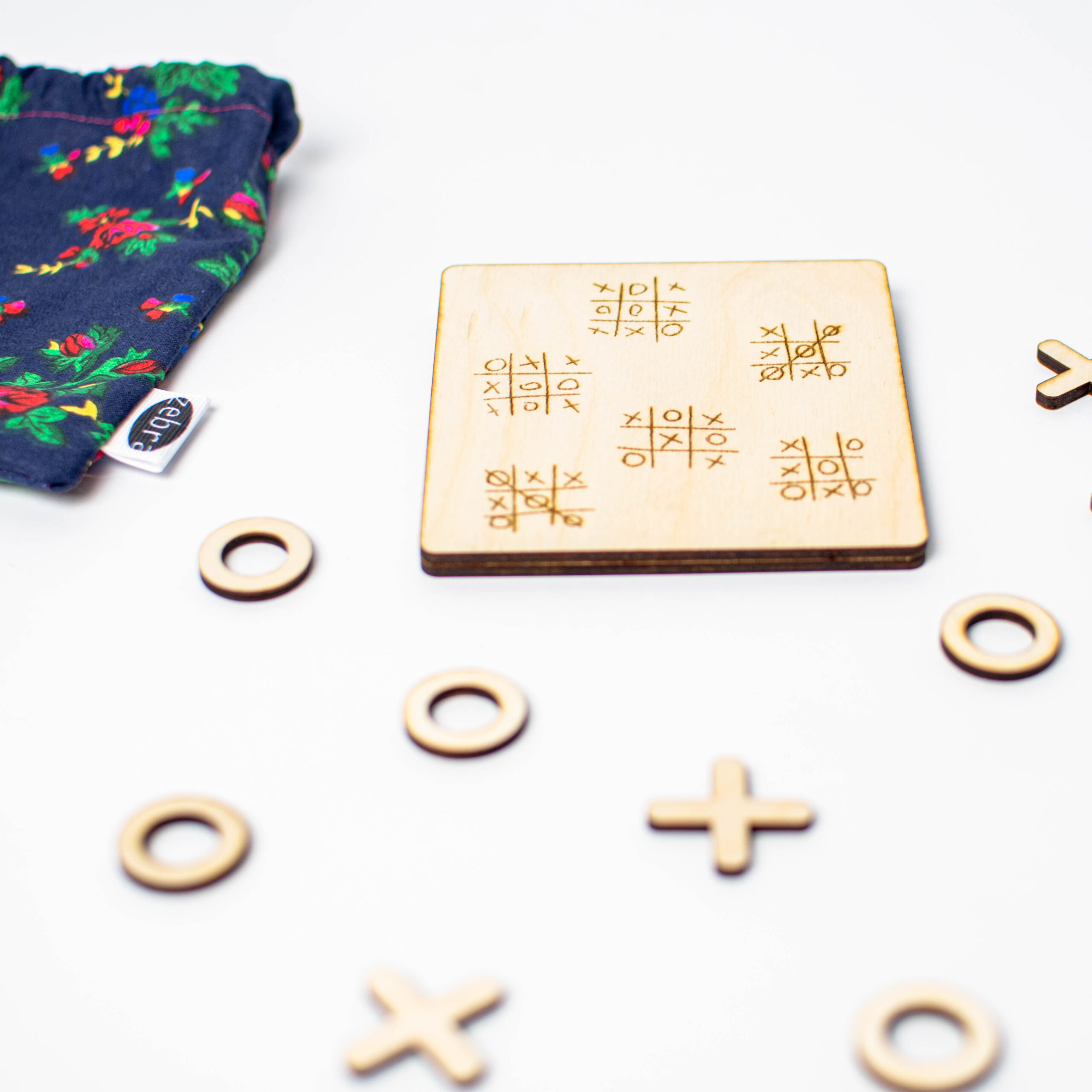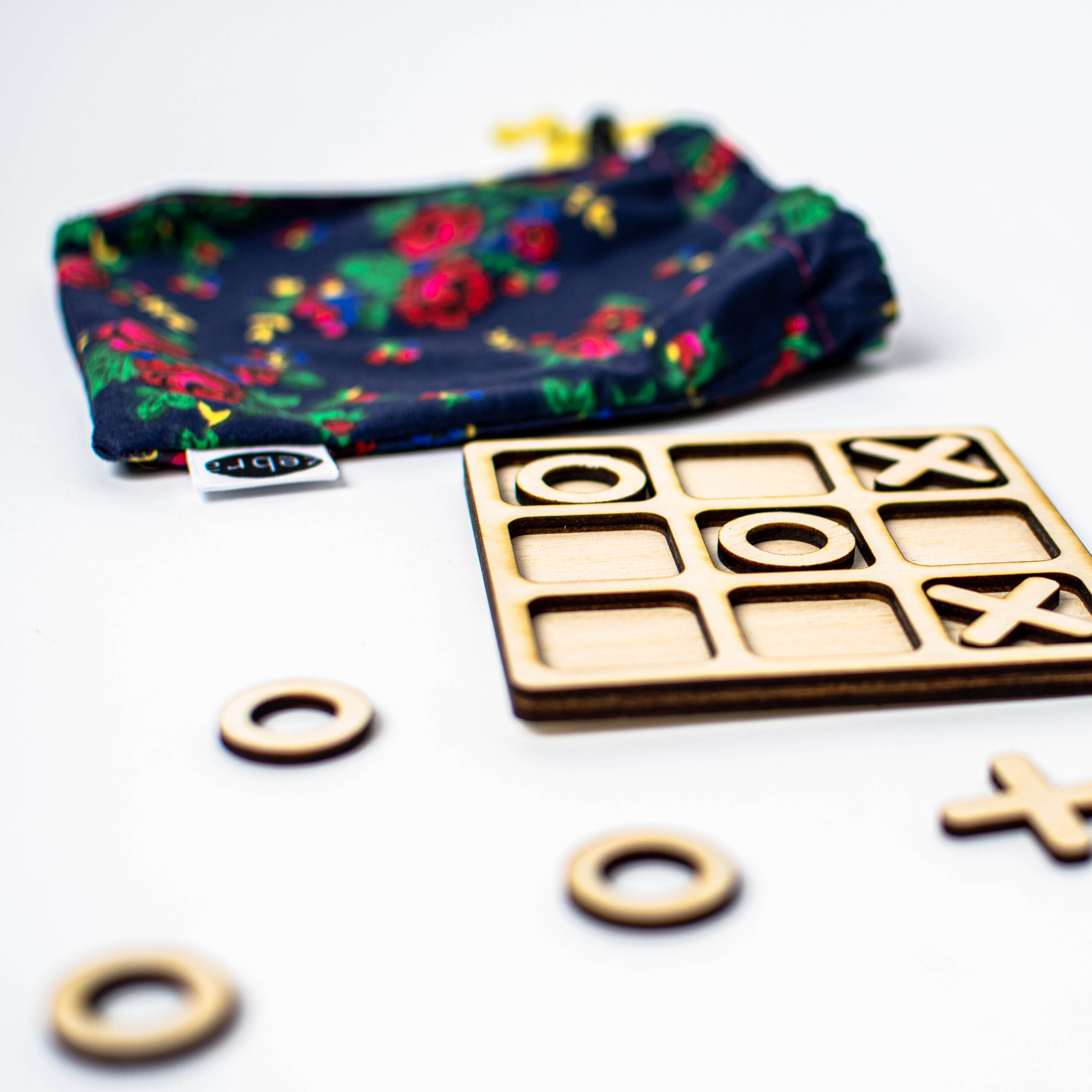 Plansza 10×10 cm, zawierająca 5 drewnianych kółek i 5 krzyżyków. Zestaw posiada również piękny bawełniany woreczek ułatwiający transport i przechowywanie.